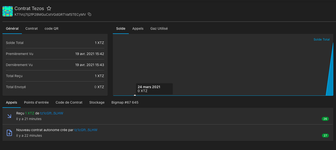 TzStats then shows a page with information related to your smart contract, e.g. the balance of the contract, the amounts sent and received, the originator's address, etc.