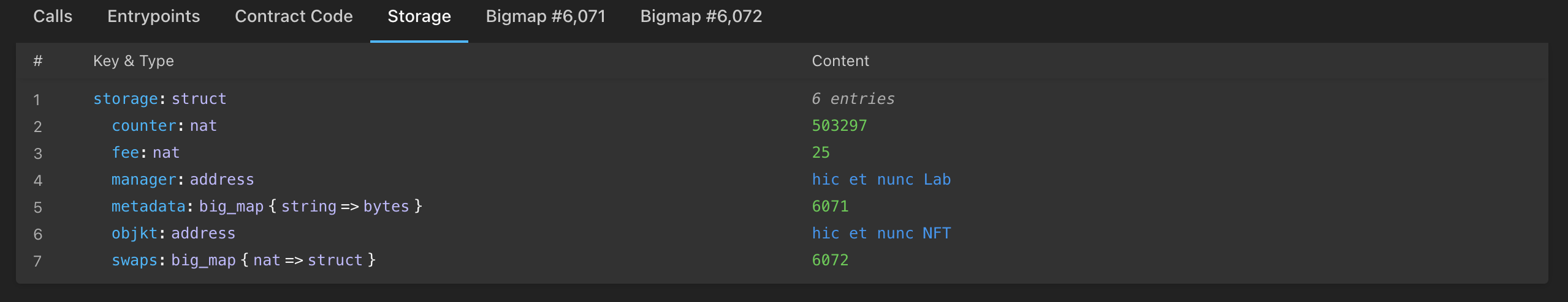 Here you have access to the content of your storage with the type of each variable and its current value. Notice that the content excludes big_maps as they are specific tabs for them.